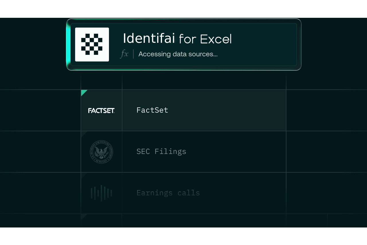 Identifai directly integrates with trusted public data sources across the financial services domain, such as CapIQ, VisibleAlpha, FactSet, SEC filings and company earnings. Users can also upload documents from which to pull data alongside their Excel workbook - expert call transcripts, broker research, market maps and much more.